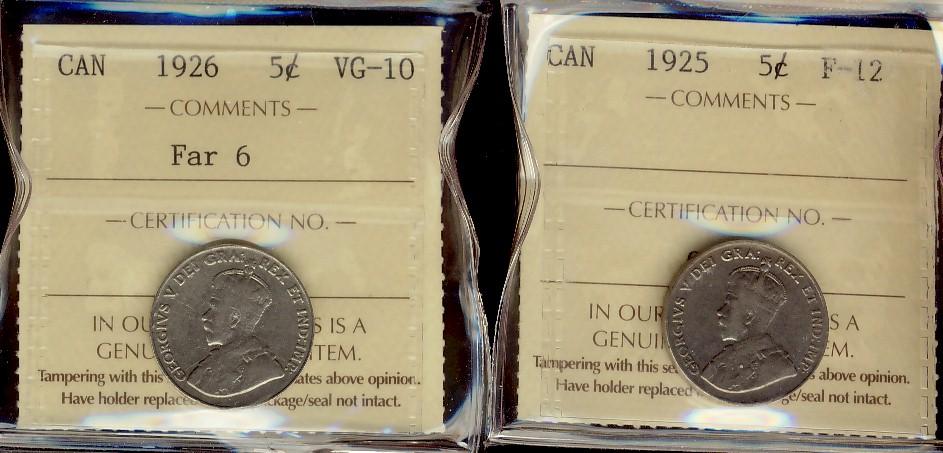 1925 F12 and 1926 Far VG10 5¢ . Lot of 2 ICCS graded coins,
