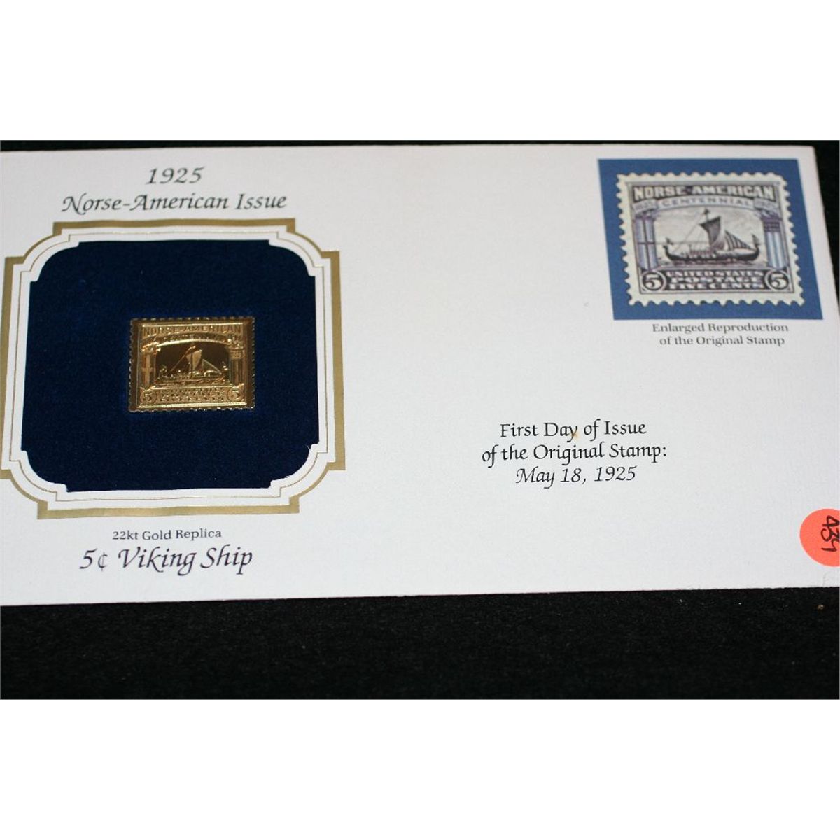 1925 First Day Issue 22K Gold Replica Stamp w/stamps, Five Cent Viking Ship