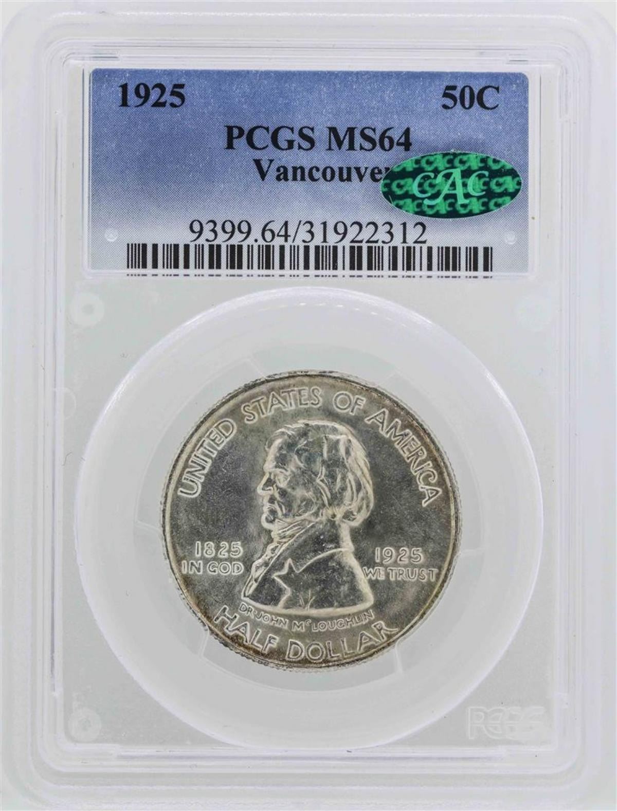 One 1925 Fort Vancouver Centennial Half Dollar PCGS Graded MS64 CAC. PCGS Certified.