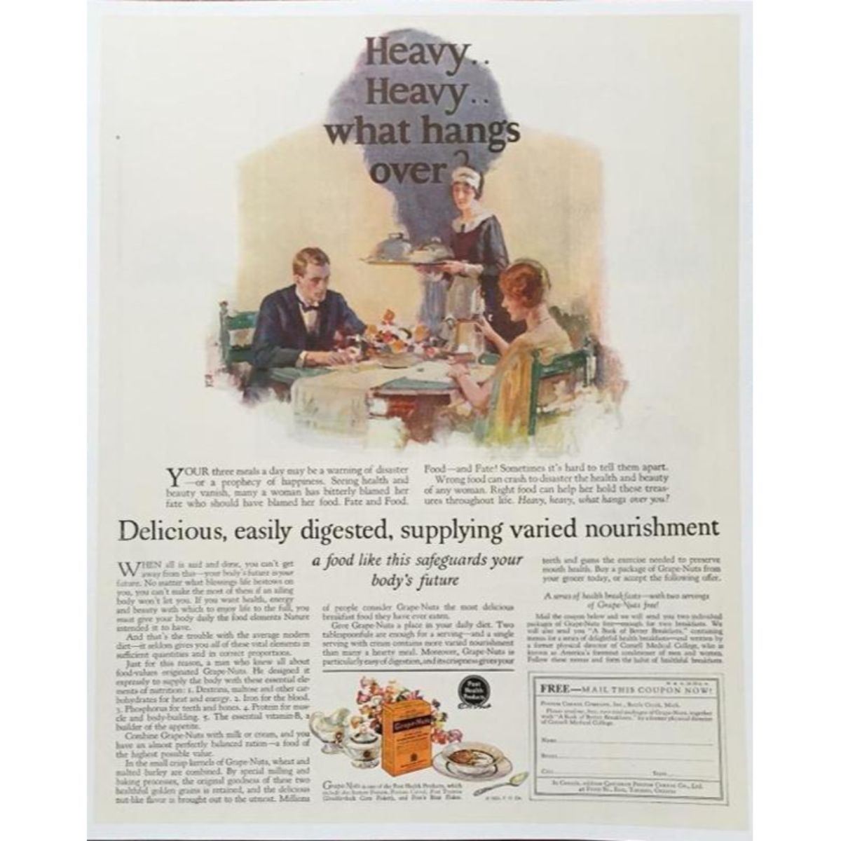 Original 1925 magazine advertisement for Grape Nuts cereal, Post Health Products. Features a couple sitting at the breakfast table, while a domestic brings a tray with cereal. Mounted on archival linen canvas for preservation. Approx 10" X 13".