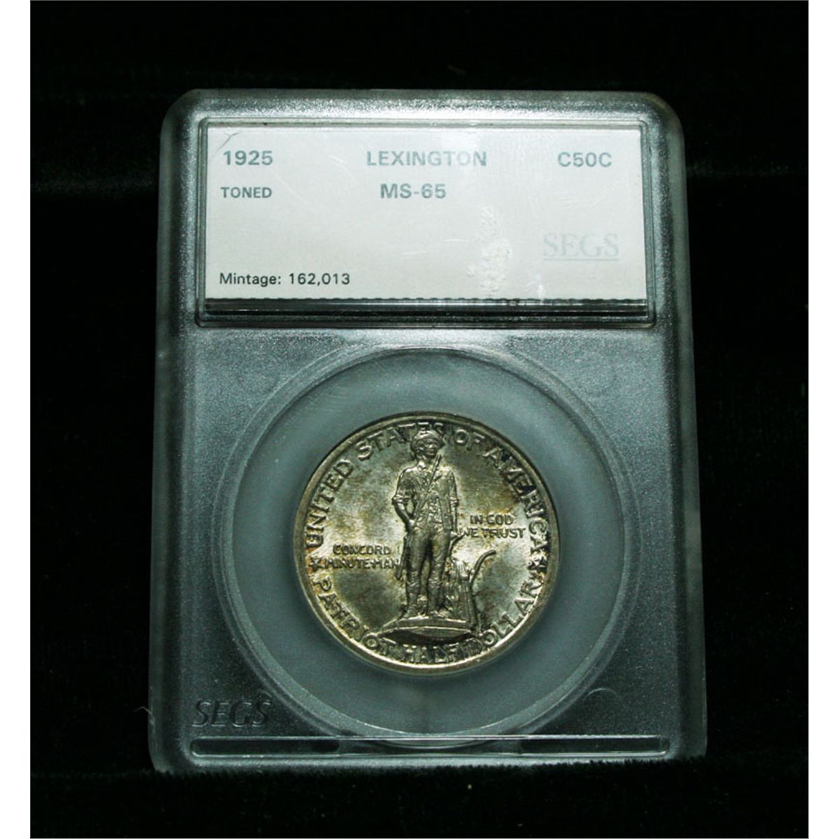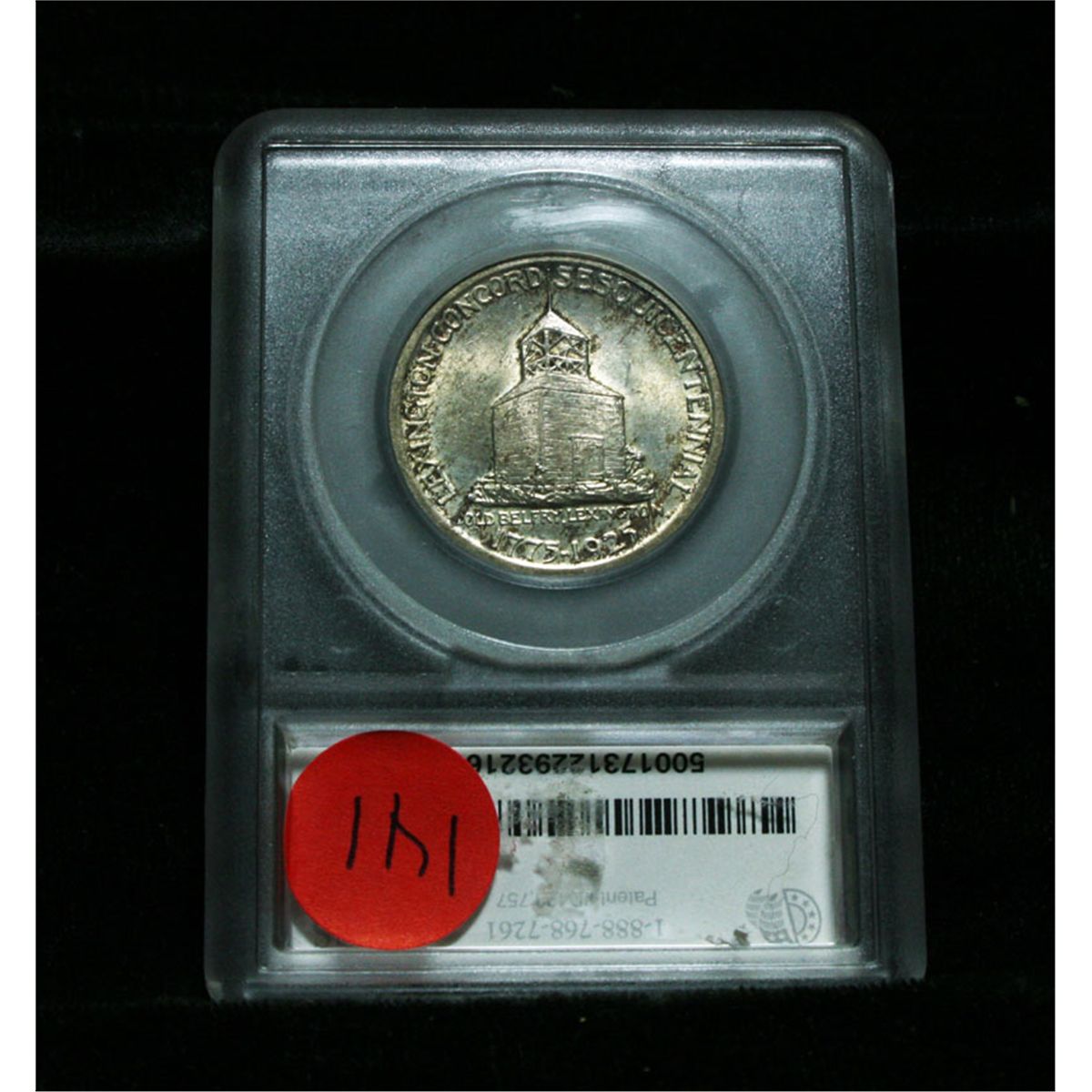 Beautifully Toned Gem Uncirculated example of this much beloved American commemorative. Dynamite Eye appeal. All Original. A Great coin. The commemorative celebrates the 150th anniversary of the "Shot Heard Round The World", which symbolically began the American Revolution and Forever changed the World. When looking at a Lexington Commemorative the points to check for wear include the Minute Man’s thighs and the near corner of the belfry, particularly toward its top. These same highpoints may also show weakness of strike. Coin World's Coin Values lists ms65 at $625 and The Wholesale Greysheet lists ms65 at $510. Estimated Value $575