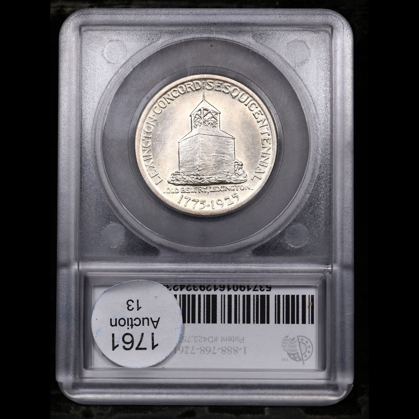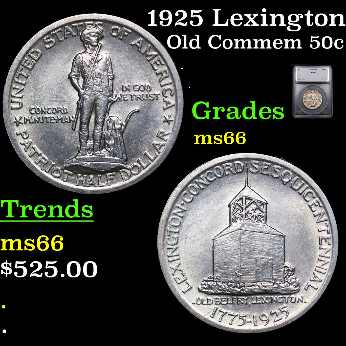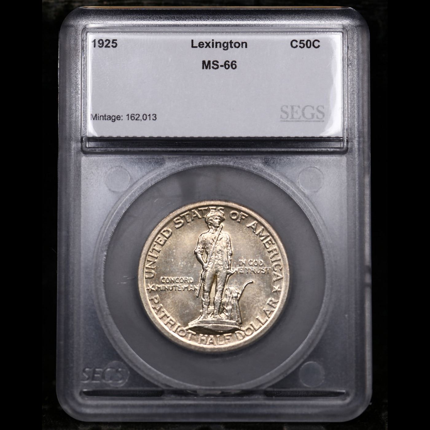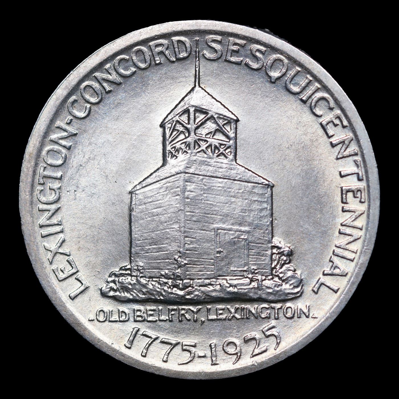 1925 Lexington Old Commem Half Dollar 50c Graded ms66 By SEGS. Another celebrated issue of the early commemorative series is the 1925 Lexington Concord Sesquicentennial Half Dollar. This coin was issued to Celebrate the 150th Anniversary of the "Shot Heard 'Round The World", which symbolically began the American Revolution and Forever Changed the World. The coins were designed by Chester Beach at the request of the local communities. The obverse was based on Daniel Chester French’s statue of a Minuteman soldier and the reverse depicts the Old Belfry from which Minutemen were alerted to action. The Lexington and Concord Half Dollars carried an authorized mintage of 300,000 coins. The Philadelphia Mint produced 162,099 coins which were nearly entirely sold. The distribution took place through local banks, with a vast number sold to the local communities and even more sold throughout New England. Wider demand was a result of the true historical significance of the commemorative issue.The coins were packaged in small wooden boxes, which featured images from the obverse and reverse of the Lexington and Concord Sesquicentennial Half Dollar, and originally sold for $1 each.When looking at a Lexington Commemorative, the points to check for wear include the Minute Man’s Thighs and the Near Corner of the Belfry, particularly Toward its Top. These same Highpoints may also show Weakness of Strike.