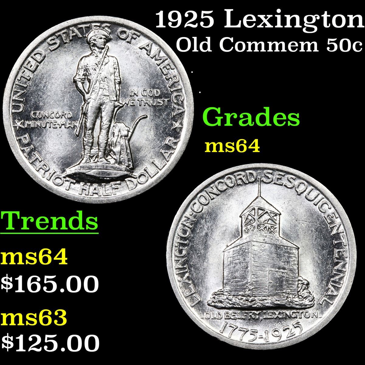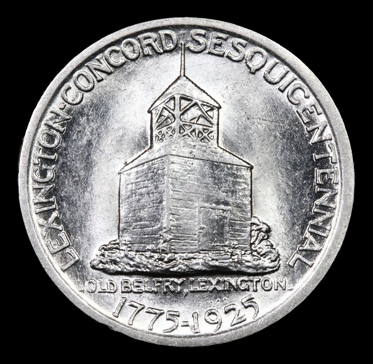 1925 Lexington . . Old Commem Half Dollar 50c Grades Choice Unc. The Lexington Commemorative Celebrates the 150th Anniversary of the "Shot Heard 'Round The World", which symbolically began the American Revolution and Forever Changed the World. When looking at a Lexington Commemorative, the points to check for wear include the Minute Man’s Thighs and the Near Corner of the Belfry, particularly Toward its Top. These same Highpoints may also show Weakness of Strike.