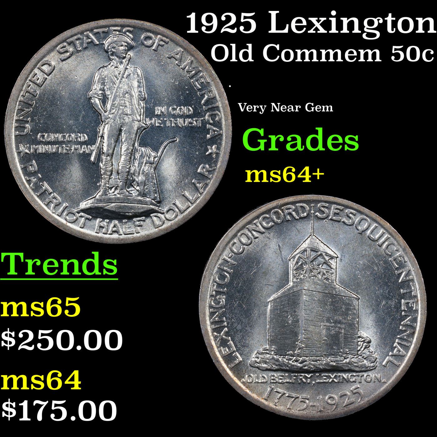 1925 Lexington Old Commem Half Dollar 50c Grades Choice+ Unc. Another celebrated issue of the early commemorative series is the 1925 Lexington Concord Sesquicentennial Half Dollar. This coin was issued to Celebrate the 150th Anniversary of the "Shot Heard 'Round The World", which symbolically began the American Revolution and Forever Changed the World. The coins were designed by Chester Beach at the request of the local communities. The obverse was based on Daniel Chester French’s statue of a Minuteman soldier and the reverse depicts the Old Belfry from which Minutemen were alerted to action. The Lexington and Concord Half Dollars carried an authorized mintage of 300,000 coins. The Philadelphia Mint produced 162,099 coins which were nearly entirely sold. The distribution took place through local banks, with a vast number sold to the local communities and even more sold throughout New England. Wider demand was a result of the true historical significance of the commemorative issue.The coins were packaged in small wooden boxes, which featured images from the obverse and reverse of the Lexington and Concord Sesquicentennial Half Dollar, and originally sold for $1 each.When looking at a Lexington Commemorative, the points to check for wear include the Minute Man’s Thighs and the Near Corner of the Belfry, particularly Toward its Top. These same Highpoints may also show Weakness of Strike.