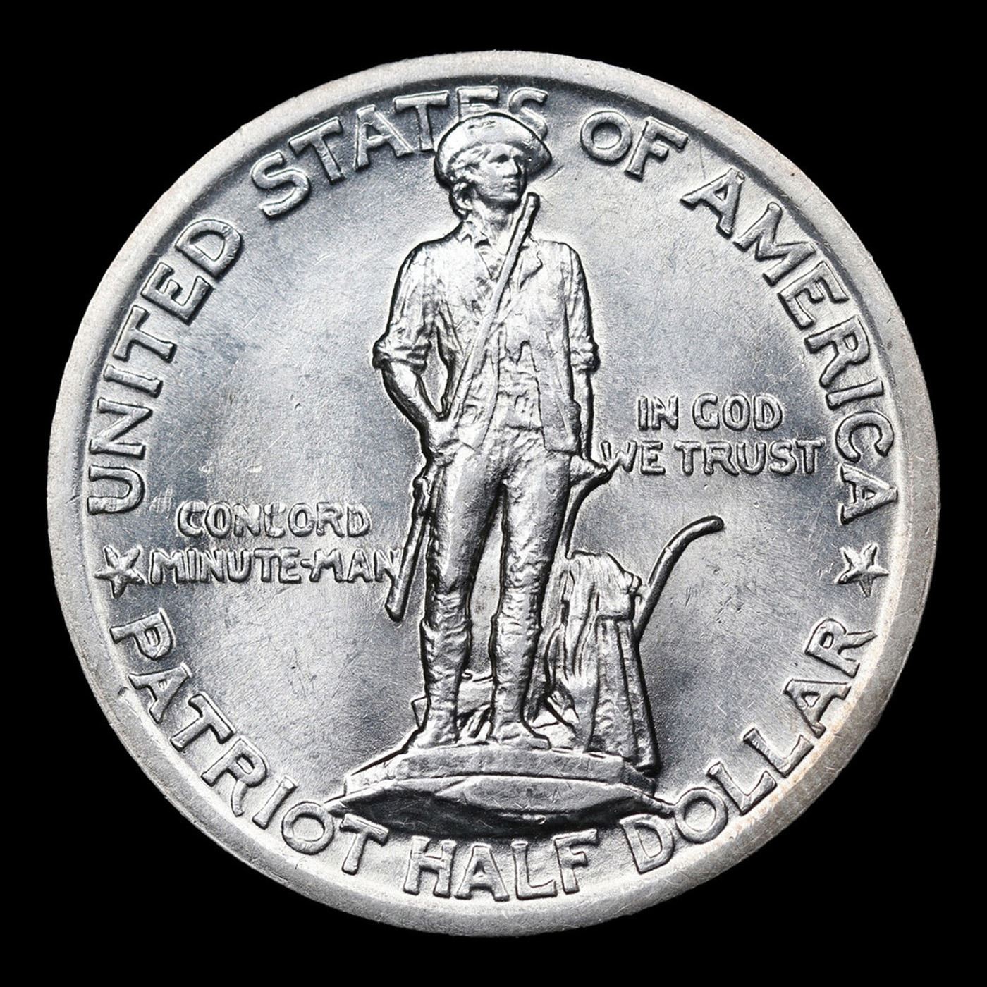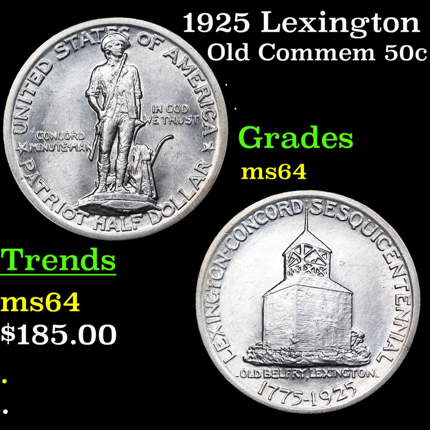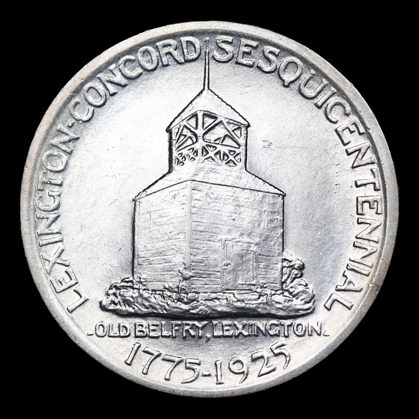 1925 Lexington Old Commem Half Dollar 50c Grades Choice Unc. Another celebrated issue of the early commemorative series is the 1925 Lexington Concord Sesquicentennial Half Dollar. This coin was issued to Celebrate the 150th Anniversary of the "Shot Heard 'Round The World", which symbolically began the American Revolution and Forever Changed the World. The coins were designed by Chester Beach at the request of the local communities. The obverse was based on Daniel Chester French’s statue of a Minuteman soldier and the reverse depicts the Old Belfry from which Minutemen were alerted to action. The Lexington and Concord Half Dollars carried an authorized mintage of 300,000 coins. The Philadelphia Mint produced 162,099 coins which were nearly entirely sold. The distribution took place through local banks, with a vast number sold to the local communities and even more sold throughout New England. Wider demand was a result of the true historical significance of the commemorative issue.The coins were packaged in small wooden boxes, which featured images from the obverse and reverse of the Lexington and Concord Sesquicentennial Half Dollar, and originally sold for $1 each.When looking at a Lexington Commemorative, the points to check for wear include the Minute Man’s Thighs and the Near Corner of the Belfry, particularly Toward its Top. These same Highpoints may also show Weakness of Strike.