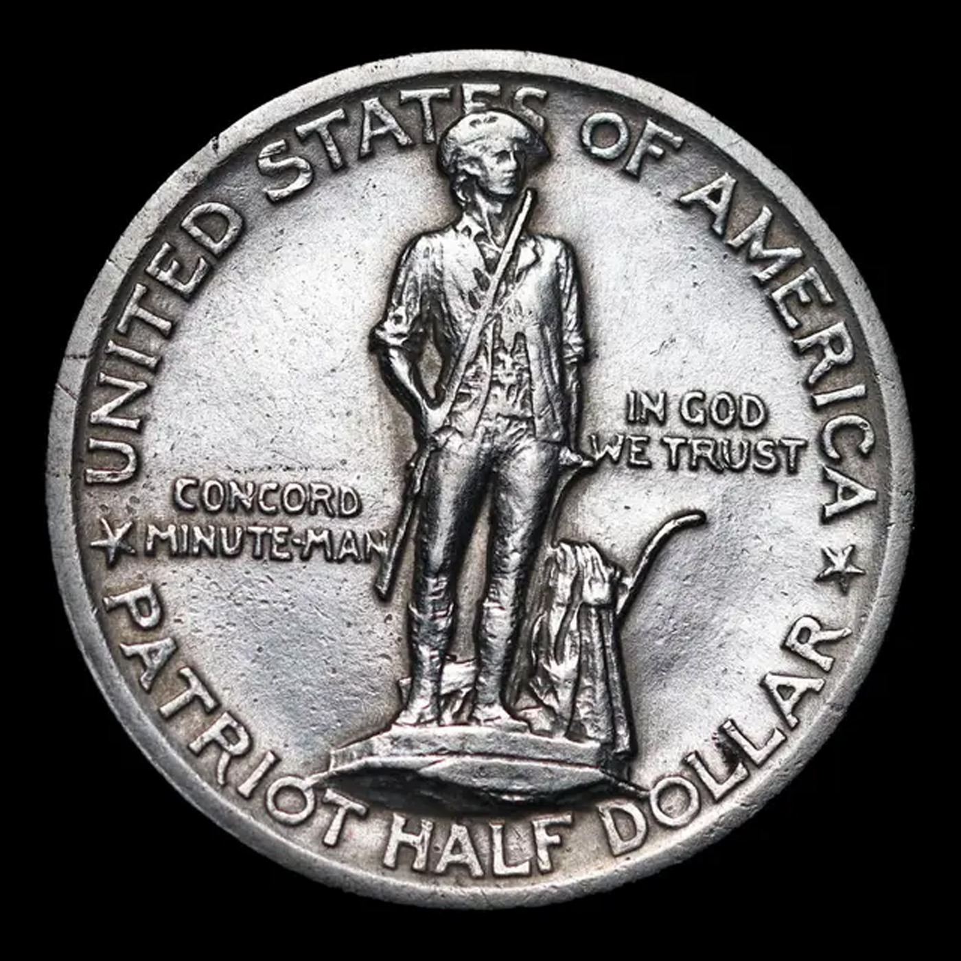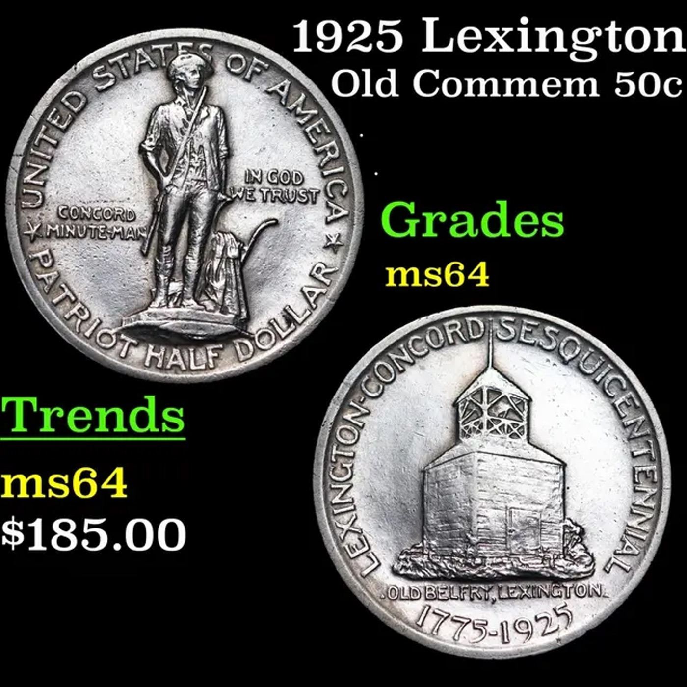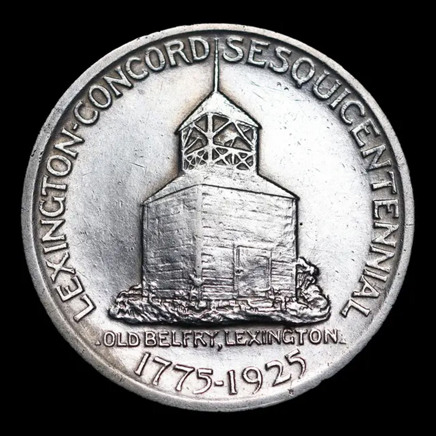 1925 Lexington Old Commem Half Dollar 50c Grades Choice Unc. Another celebrated issue of the early commemorative series is the 1925 Lexington Concord Sesquicentennial Half Dollar. This coin was issued to Celebrate the 150th Anniversary of the "Shot Heard 'Round The World", which symbolically began the American Revolution and Forever Changed the World. The coins were designed by Chester Beach at the request of the local communities. The obverse was based on Daniel Chester French’s statue of a Minuteman soldier and the reverse depicts the Old Belfry from which Minutemen were alerted to action. The Lexington and Concord Half Dollars carried an authorized mintage of 300,000 coins. The Philadelphia Mint produced 162,099 coins which were nearly entirely sold. The distribution took place through local banks, with a vast number sold to the local communities and even more sold throughout New England. Wider demand was a result of the true historical significance of the commemorative issue.The coins were packaged in small wooden boxes, which featured images from the obverse and reverse of the Lexington and Concord Sesquicentennial Half Dollar, and originally sold for $1 each.When looking at a Lexington Commemorative, the points to check for wear include the Minute Man’s Thighs and the Near Corner of the Belfry, particularly Toward its Top. These same Highpoints may also show Weakness of Strike.