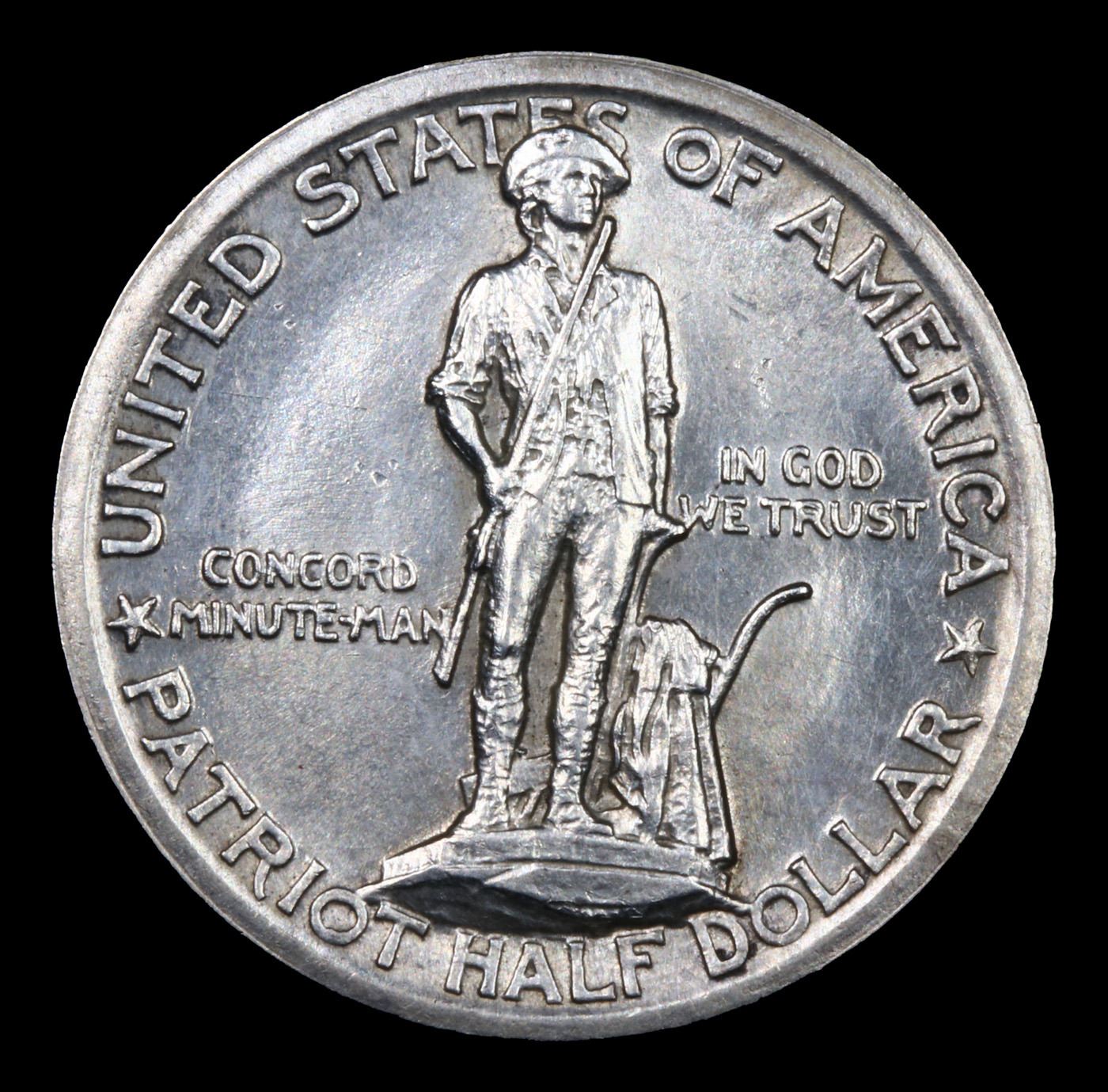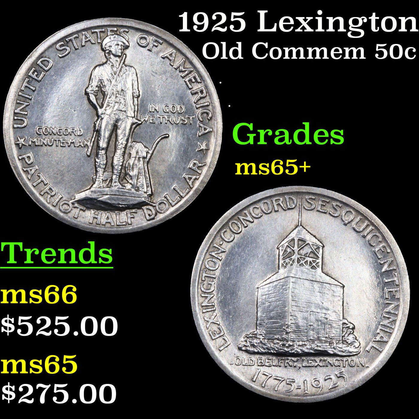 1925 Lexington Old Commem Half Dollar 50c Grades GEM+ Unc. Another celebrated issue of the early commemorative series is the 1925 Lexington Concord Sesquicentennial Half Dollar. This coin was issued to Celebrate the 150th Anniversary of the "Shot Heard 'Round The World", which symbolically began the American Revolution and Forever Changed the World. The coins were designed by Chester Beach at the request of the local communities. The obverse was based on Daniel Chester French’s statue of a Minuteman soldier and the reverse depicts the Old Belfry from which Minutemen were alerted to action. The Lexington and Concord Half Dollars carried an authorized mintage of 300,000 coins. The Philadelphia Mint produced 162,099 coins which were nearly entirely sold. The distribution took place through local banks, with a vast number sold to the local communities and even more sold throughout New England. Wider demand was a result of the true historical significance of the commemorative issue.The coins were packaged in small wooden boxes, which featured images from the obverse and reverse of the Lexington and Concord Sesquicentennial Half Dollar, and originally sold for $1 each.When looking at a Lexington Commemorative, the points to check for wear include the Minute Man’s Thighs and the Near Corner of the Belfry, particularly Toward its Top. These same Highpoints may also show Weakness of Strike.