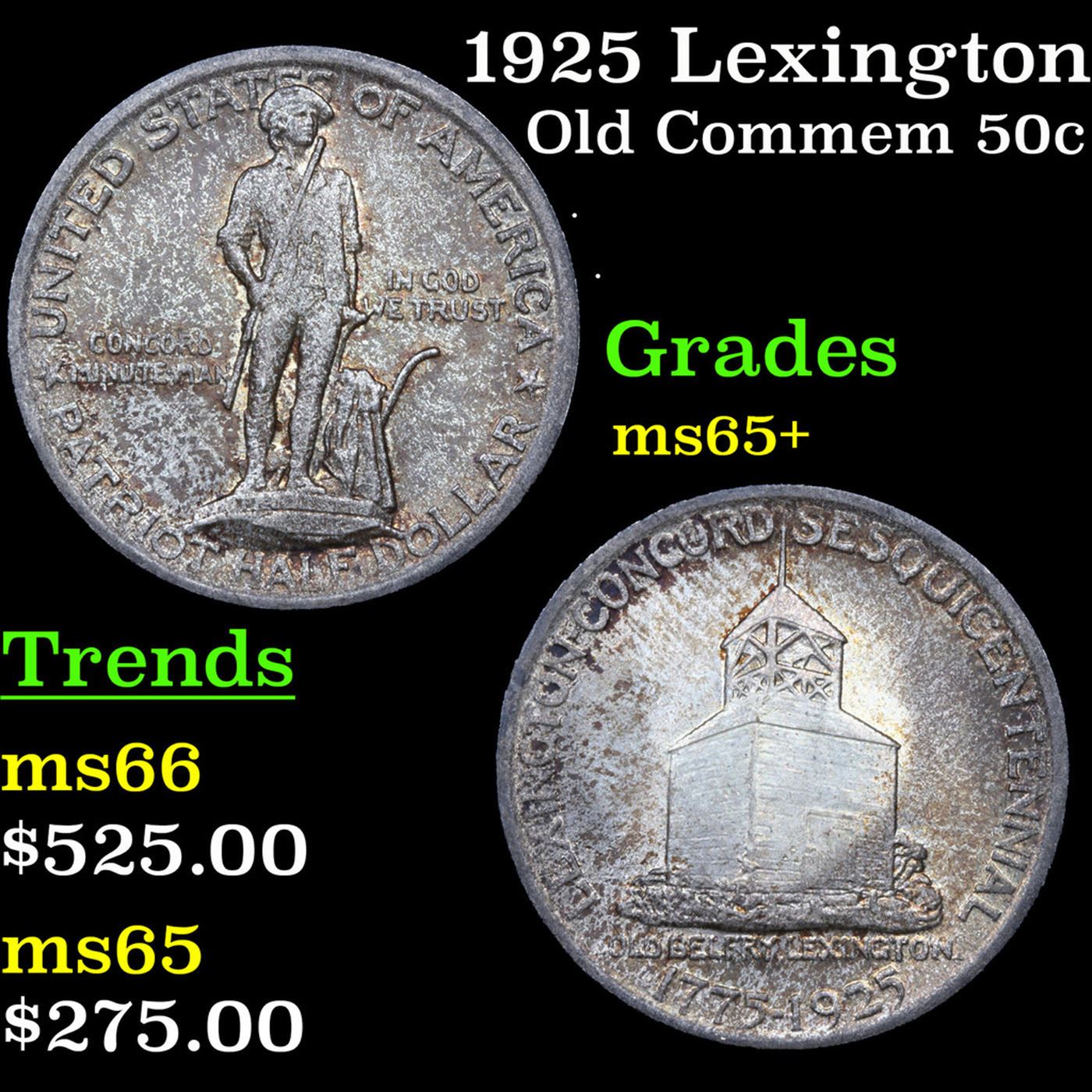 1925 Lexington Old Commem Half Dollar 50c Grades GEM+ Unc. Another celebrated issue of the early commemorative series is the 1925 Lexington Concord Sesquicentennial Half Dollar. This coin was issued to Celebrate the 150th Anniversary of the "Shot Heard 'Round The World", which symbolically began the American Revolution and Forever Changed the World. The coins were designed by Chester Beach at the request of the local communities. The obverse was based on Daniel Chester French’s statue of a Minuteman soldier and the reverse depicts the Old Belfry from which Minutemen were alerted to action. The Lexington and Concord Half Dollars carried an authorized mintage of 300,000 coins. The Philadelphia Mint produced 162,099 coins which were nearly entirely sold. The distribution took place through local banks, with a vast number sold to the local communities and even more sold throughout New England. Wider demand was a result of the true historical significance of the commemorative issue.The coins were packaged in small wooden boxes, which featured images from the obverse and reverse of the Lexington and Concord Sesquicentennial Half Dollar, and originally sold for $1 each.When looking at a Lexington Commemorative, the points to check for wear include the Minute Man’s Thighs and the Near Corner of the Belfry, particularly Toward its Top. These same Highpoints may also show Weakness of Strike.