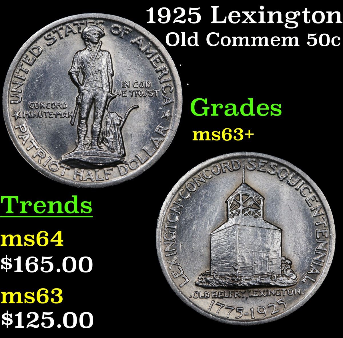 1925 Lexington Old Commem Half Dollar 50c Grades Select+ Unc. The Lexington Commemorative Celebrates the 150th Anniversary of the "Shot Heard 'Round The World", which symbolically began the American Revolution and Forever Changed the World. When looking at a Lexington Commemorative, the points to check for wear include the Minute Man’s Thighs and the Near Corner of the Belfry, particularly Toward its Top. These same Highpoints may also show Weakness of Strike.