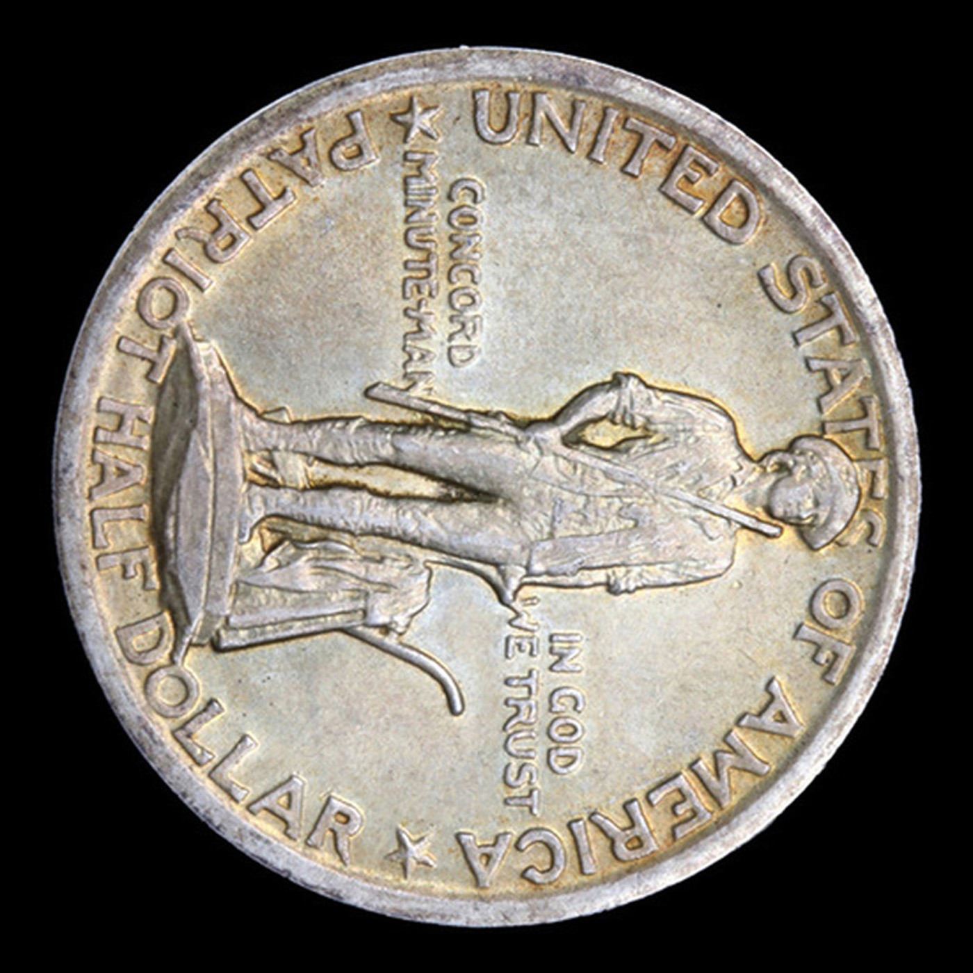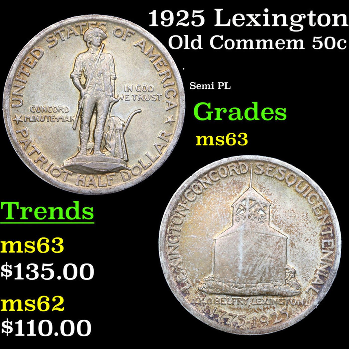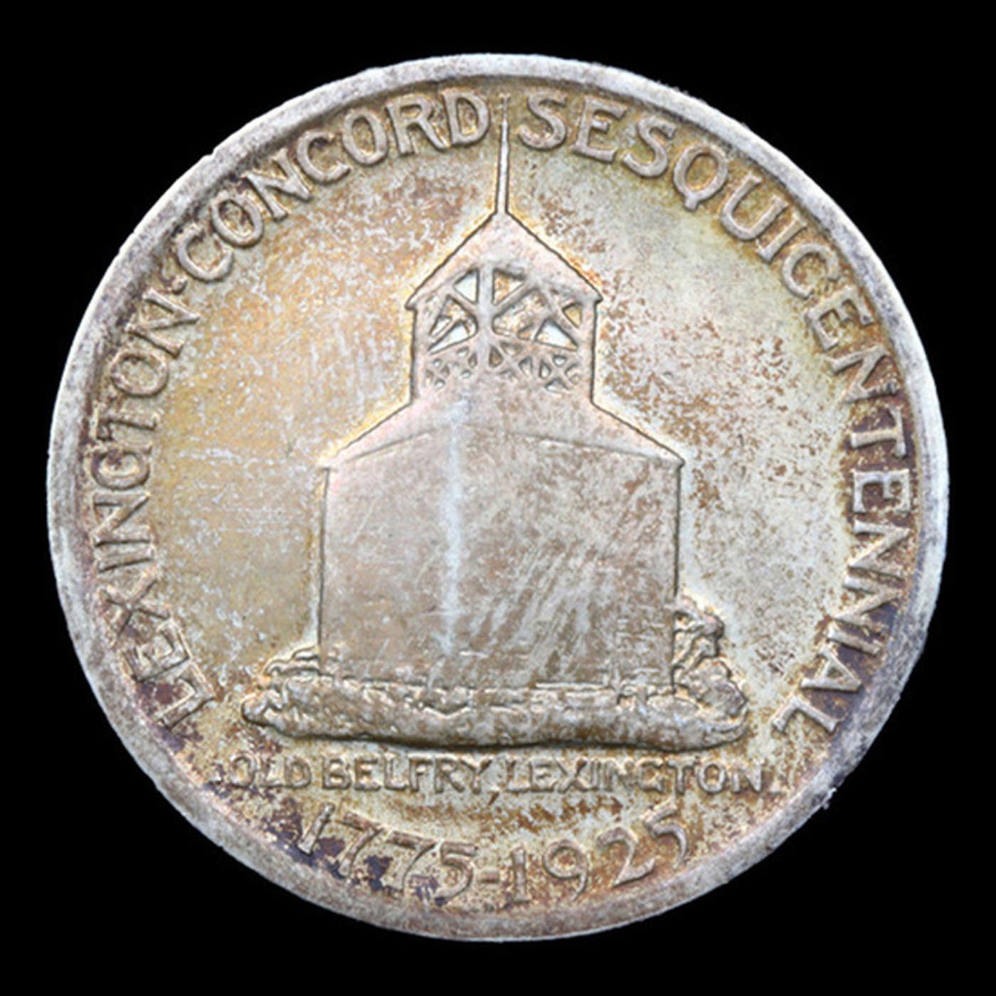 1925 Lexington Old Commem Half Dollar 50c Grades Select Unc. Another celebrated issue of the early commemorative series is the 1925 Lexington Concord Sesquicentennial Half Dollar. This coin was issued to Celebrate the 150th Anniversary of the "Shot Heard 'Round The World", which symbolically began the American Revolution and Forever Changed the World. The coins were designed by Chester Beach at the request of the local communities. The obverse was based on Daniel Chester French’s statue of a Minuteman soldier and the reverse depicts the Old Belfry from which Minutemen were alerted to action. The Lexington and Concord Half Dollars carried an authorized mintage of 300,000 coins. The Philadelphia Mint produced 162,099 coins which were nearly entirely sold. The distribution took place through local banks, with a vast number sold to the local communities and even more sold throughout New England. Wider demand was a result of the true historical significance of the commemorative issue.The coins were packaged in small wooden boxes, which featured images from the obverse and reverse of the Lexington and Concord Sesquicentennial Half Dollar, and originally sold for $1 each.When looking at a Lexington Commemorative, the points to check for wear include the Minute Man’s Thighs and the Near Corner of the Belfry, particularly Toward its Top. These same Highpoints may also show Weakness of Strike.