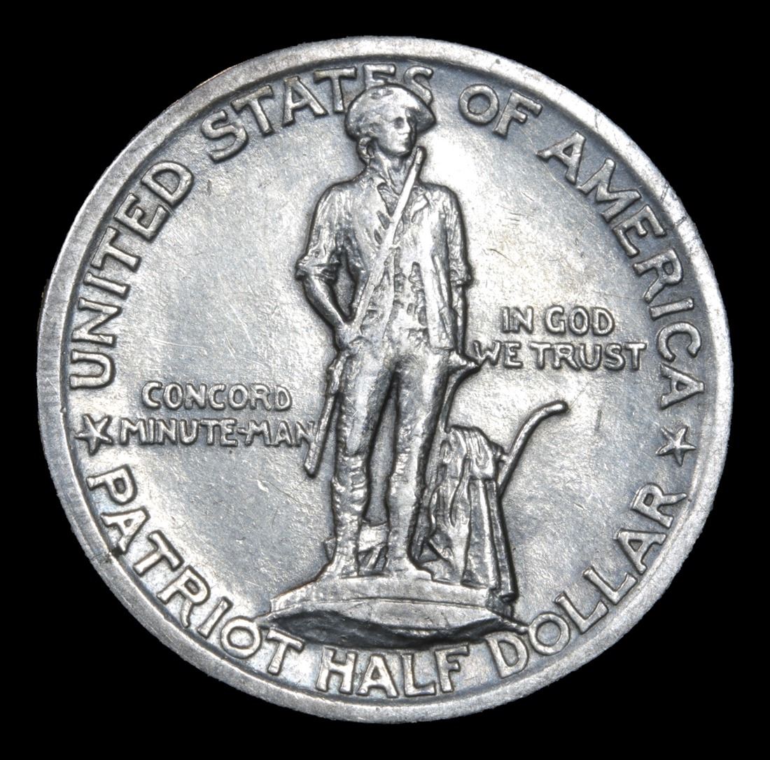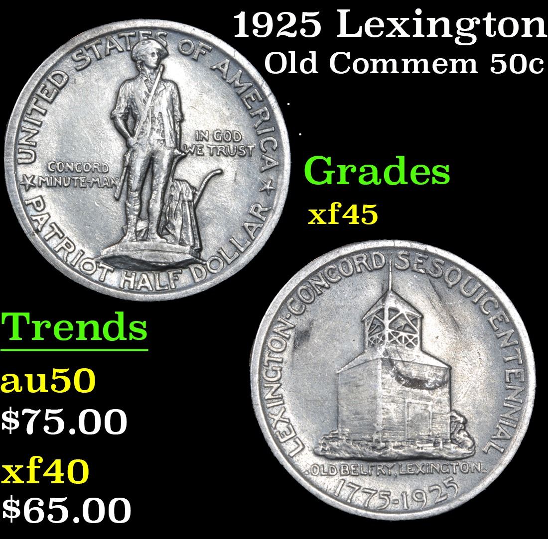 1925 Lexington Old Commem Half Dollar 50c Grades xf+. The Lexington Commemorative Celebrates the 150th Anniversary of the "Shot Heard 'Round The World", which symbolically began the American Revolution and Forever Changed the World. When looking at a Lexington Commemorative, the points to check for wear include the Minute ManÕs Thighs and the Near Corner of the Belfry, particularly Toward its Top. These same Highpoints may also show Weakness of Strike.