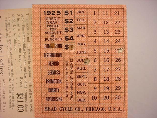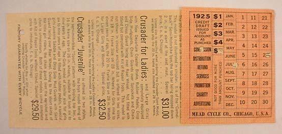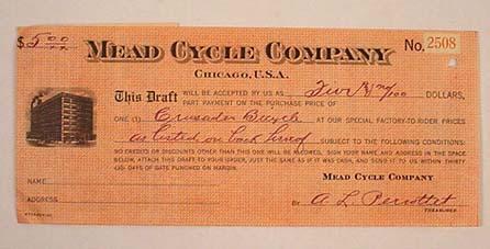 1925 MEAD CYCLE COMPANY CREDIT DRAFT / BROCHURE - Credit draft for $5.00 issued for commission. Has special factory to rider prices and descriptions for the new "Crusader" bicycles on back. Approx. 10.75" by 3.5"