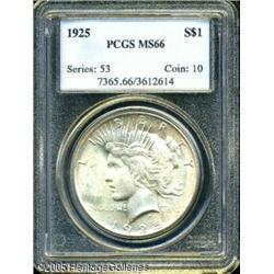<B>1925<img border='0' src='http://www.heritagecoins.com/images/star.gif' width=10 height=10>$1 MS66 PCGS.</B></I> The creamy surfaces are expertly preserved and lightly toned, with flashy, radiant luster and a very clean overall appearance. A premium example of this otherwise common issue. Lot:10707