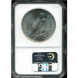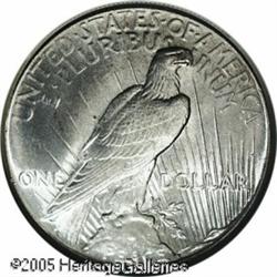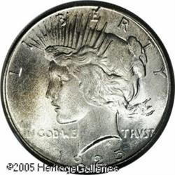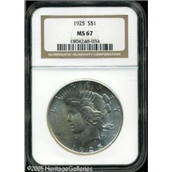 <B>1925<img border='0' src='http://www.heritagecoins.com/images/star.gif' width=10 height=10>$1 MS67 NGC.</B></I> Although this is one of the most common of all Peace Dollars in grades through and including Gem quality, Superb Gem examples such as this are seldom seen. In fact, PCGS and NGC have combined to certify just 77 examples at this grade level, and each of these services have graded a single finer coin. This lovely dollar has brilliant luster with satiny surfaces. Both sides are almost completely white, with faint champagne color in the left obverse field. Population: 16 in 67, 1 finer (1/05). Lot:10709