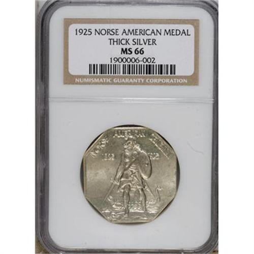 <B>1925 Medal Norse Thick Planchet MS66 NGC.</B></I> NGC Census: (0/0). PCGS Population (26/0). (#9450)<BR><BR><b>Shipping:</b> Coins & Currency (<a target="_blank" href="http://www.heritageauctions.com/common/shipping.php">view shipping information</a>)