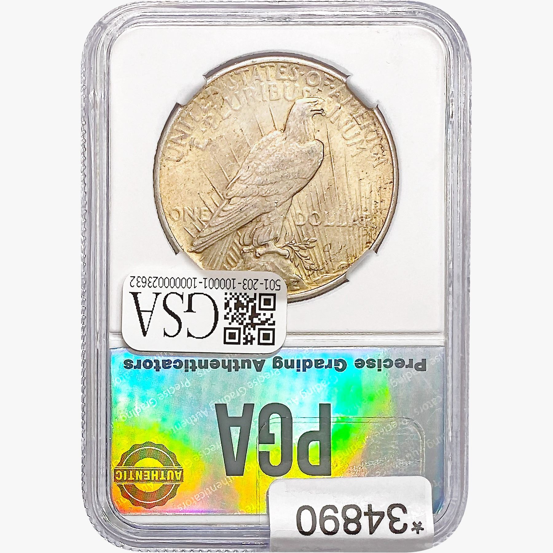 COINS AND CURRENCY LISTED IN GSA’S CATALOG AS GRADED AND ENCAPSULATED BY PCGS, NGC, ANACS, ICG, PCGS CURRENCY, PMG, PCGS BANKNOTE GRADING, CMC OR ANY OTHER THIRD-PARTY GRADING SERVICE ARE LIKEWISE SOLD “AS-IS” EXCEPT AS EXPRESSLY SET FORTH HEREIN. ALL THIRD-PARTY GRADING SERVICE GUARANTEES, INCLUDING AUTHENTICITY, ARE THE SOLE RESPONSIBILITY OF THE THIRD-PARTY GRADING SERVICE AND NOT WARRANTIES OR GUARANTEES OF GSA. BIDDERS SHOULD CONTACT THESE THIRD-PARTY GRADING SERVICES DIRECTLY WITH RESPECT TO ANY CLAIMS OR QUESTIONS THEY MAY HAVE CONCERNING THEIR GUARANTEES AND WARRANTIES. BIDDERS ACKNOWLEDGE AND AGREE THAT AUCTIONEER IS NOT BOUND BY OR LIABLE FOR ANY OPINION OR CERTIFICATION BY ANY THIRD-PARTY GRADING SERVICE. REMOVAL OF A PRODUCT FROM ITS PROTECTIVE CASING OR HOLDER OR ALTERATION OF ANY COIN HOLDER WAIVES ALL RIGHTS CONCERNING THE PRODUCT CONTAINED THEREIN.