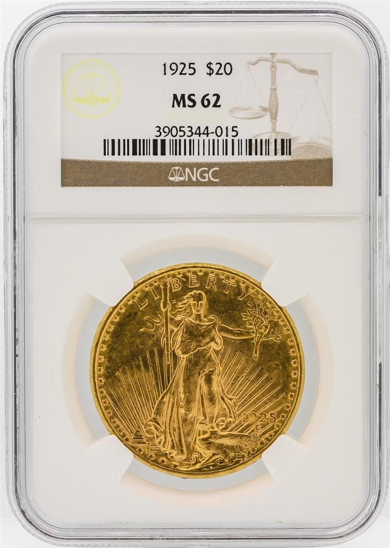 One 1925 NGC MS62 $20 St. Gaudens Double Eagle Gold Coin. NGC Certified.