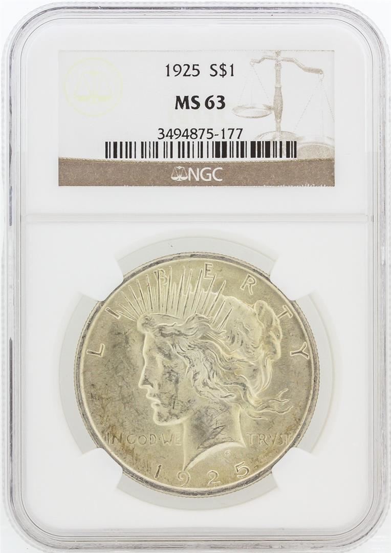 One 1925 NGC MS63 Peace Silver Dollar. NGC Certified.