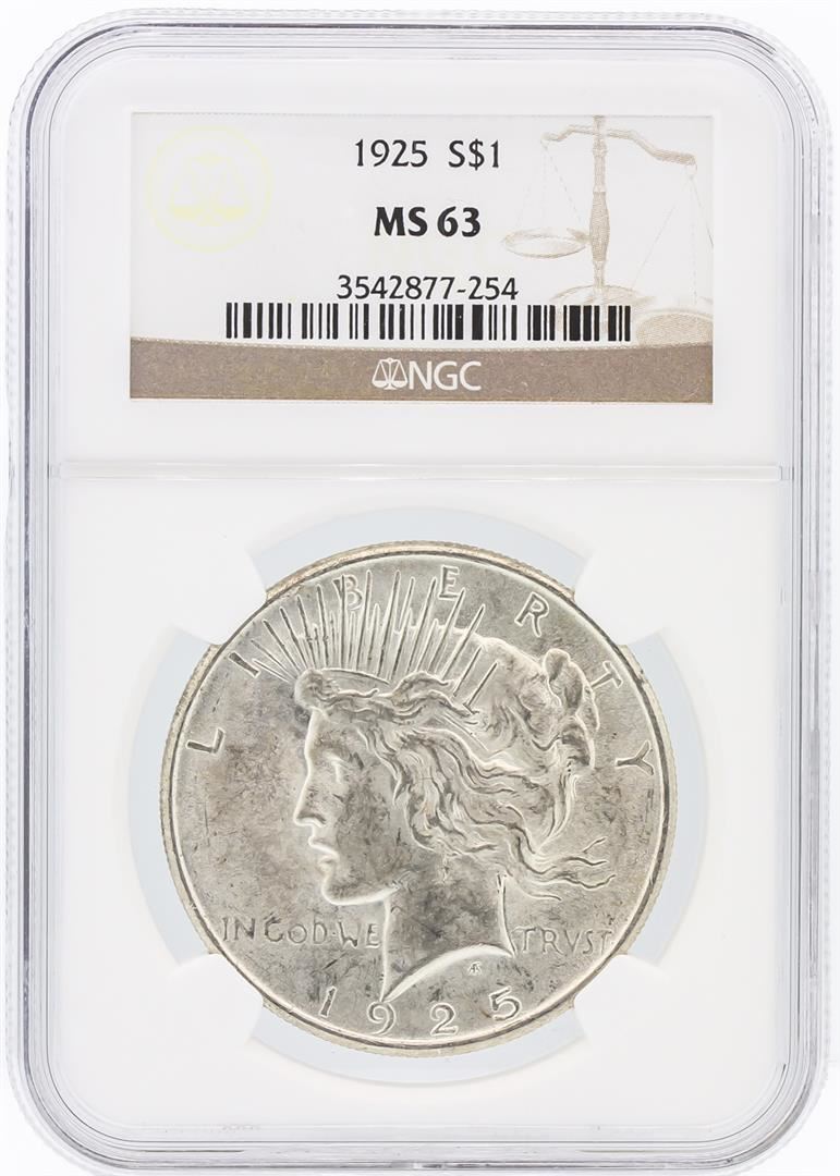 One 1925 NGC MS63 Peace Silver Dollar. NGC Certified.