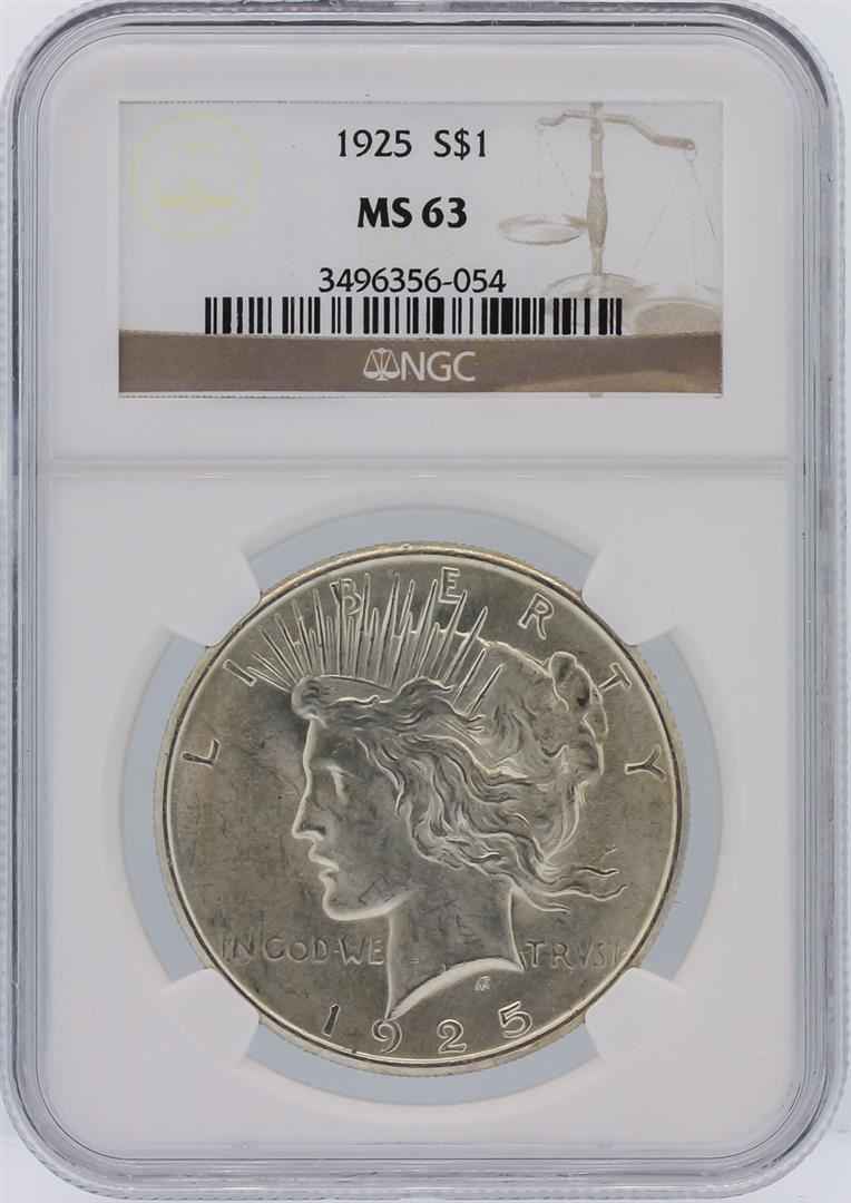 One 1925 NGC MS63 Peace Silver Dollar. NGC Certified.