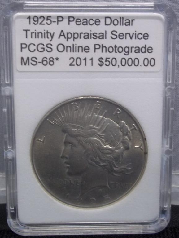 1925-P Silver Peace Dollar MS-68. PCGS Online Photograde with appraisal from Trinity Appraisal Service. $50,000.00. Control # F035015