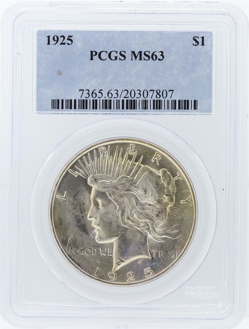 One 1925 PCGS MS63 Peace Silver Dollar. PCGS Certified.