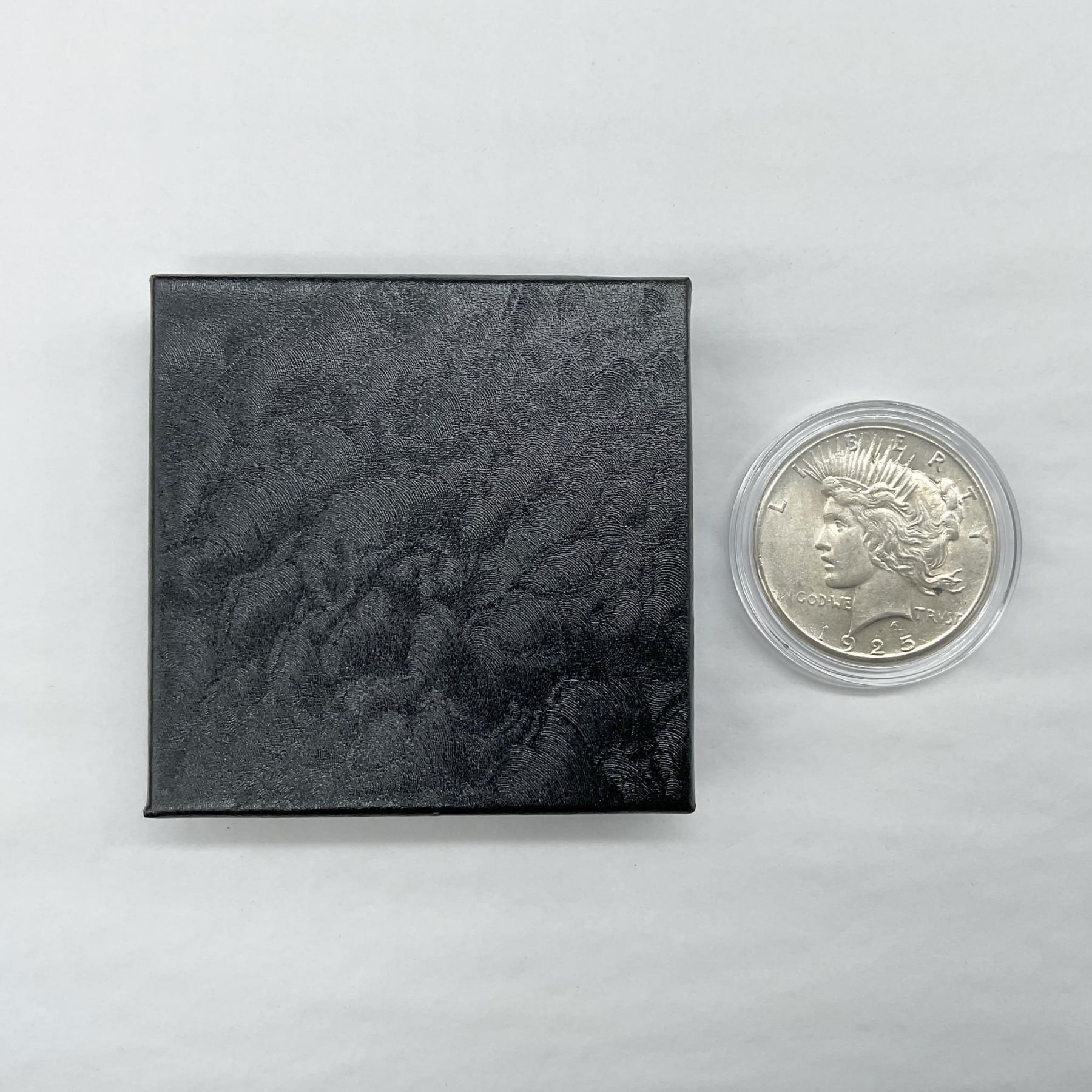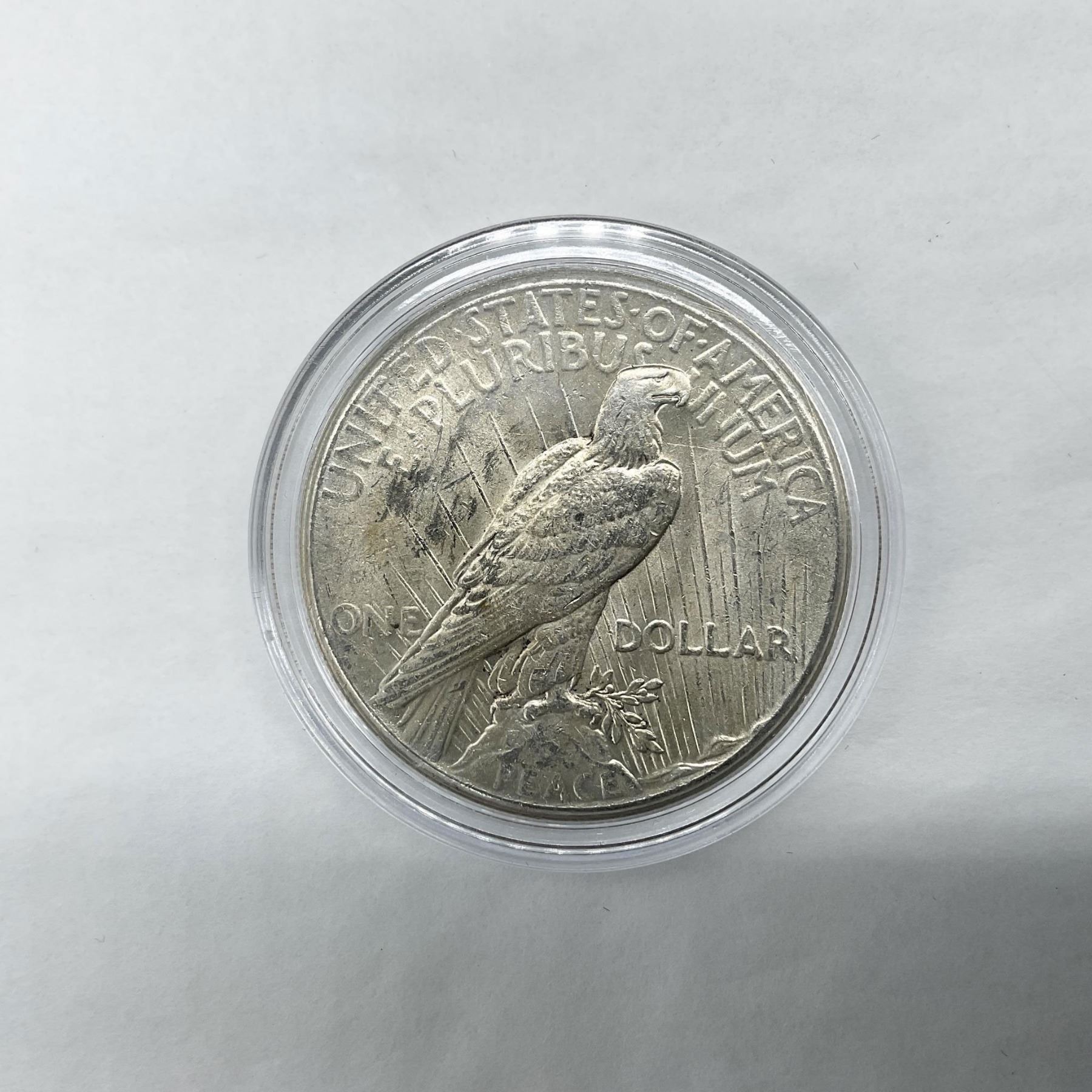 The obverse side features Liberty in profile with a radiant crown. The reverse side depicts an eagle perched on a rock holding an olive branch. The coin is in a protective case. Approximate measurement of the case: 0.25"D x 1.75" dia. This item has a box: 3"L x 3"W x 0.75"H.