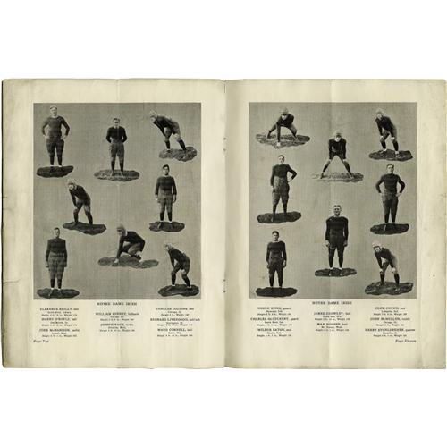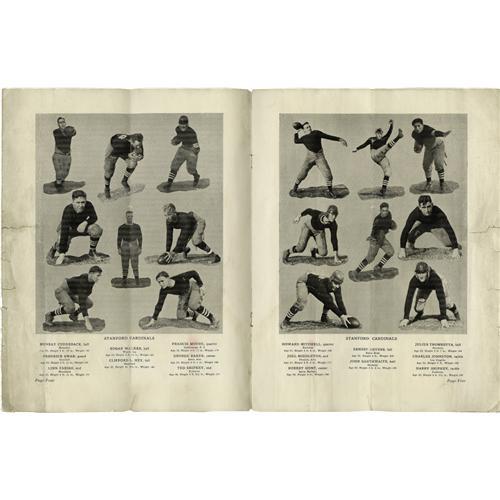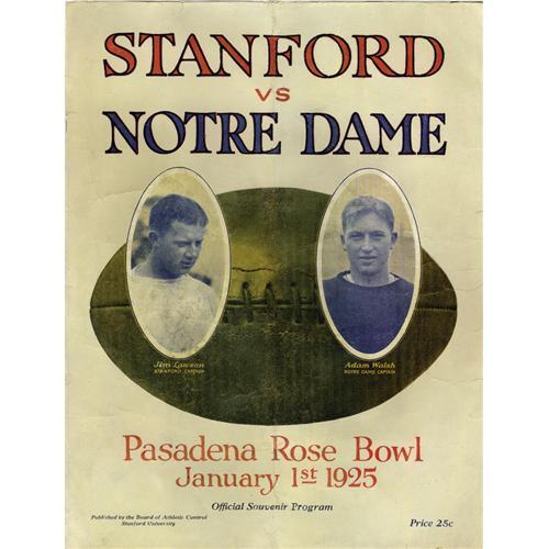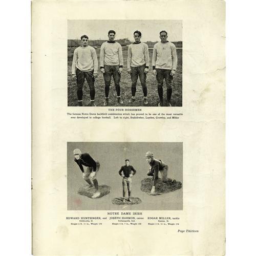 <B>1925 Rose Bowl Program featuring The Four Horsemen.</B></I> Presented here is one of the toughest and most desirable football programs in the hobby, present in only the most advanced of collections. The reasons for its scarcity are not tough to imagine. First and foremost, we must consider that it's over eight decades old! And secondly, the rather delicate paper stock that was used in its construction makes it far more susceptible to the perils of age than contemporary World Series programs, for example. As such, only a scant few specimens from this Southern California event have survived. The intense desirability of the program is related most directly to the appearance of college football's storied backfield of Stuhldreher, Layden, Crowley and Miller, dubbed by famed sportswriter Grantland Rice as "The Four Horsemen of the Apocalypse." Fine images of the quartet, both individually and as a group, appear within this amazing eighteen-page publication. The Horsemen did not disappoint their coach Knute Rockne this day, cruising to a twenty-seven to ten win over Ernie Nevers' Stanford Cardinals in the Fighting Irish's first and only Rose Bowl appearance. The program shows an expected degree of wear, with a vertical center fold and some short horizontal tears that do not extend past the wide white borders of the interior pages. Somehow the cover has been spared the bulk of these flaws, and it presents remarkably well as a result. The binding remains tight, keeping the program solid and complete. A wait for another, much less a finer example, will surely be a long one. <BR><BR><B>Important notice:</B> Heritage usually auctions material at the rate of 200-250 lots per hour. On some occasions eBay Live bid software or the Internet may not be able to keep up with the pace of the auction. We recommend placing a realistic absentee bid now as insurance to avoid disappointment. Occasionally the auctioneer may eliminate or reject an eBay Live bid, and the auctioneer may also reopen a lot after the close of the eBay live bidding (usually because we missed an audience bid), and may reject your bid even if it shows you as the winning bidder. By bidding via eBay Live, you agree that Heritage may award the lot to another bidder at its sole discretion under the circumstances described above or any other reasonable circumstances. Since eBay bids are not shown to us until we open the lot on the floor, we treat those bids just like floor bids. In most cases the floor responds before the eBay bid is presented to us, due to Internet lag time, so for consistency we have made it a policy that floor bids are always considered first over tie eBay live bids. Also please note that all Heritage lots purchased through eBay Live carry a 22.5% Buyer's Premium. Please make sure you read the Terms and Conditions before you bid. This lot is being auctioned in conjunction with a live floor auction by Heritage Galleries & Auctioneers. All final auction and invoice information will be supplied by Heritage Galleries & Auctioneers, and all other information should be considered preliminary. Lot:19243 <BR><BR><B>Winning Notification and Billing:</B> After the FINAL session in this auction is complete, Heritage will send e-mail and snail mail invoices. This process normally takes several days. All final auction and invoice information will be supplied by Heritage Galleries & Auctioneers, and all other information should be considered preliminary. <BR><BR>This auction will be conducted on a live auction floor and over the Internet through eBay Live. If you choose to place an absentee bid, please take a moment to <font color='#0000ff'><u><a href='http://pages.ebay.com/liveauctions/help/before/laabsentee.html'>learn how eBay Live absentee bidding works</a></u></font><font color='#000000'>
