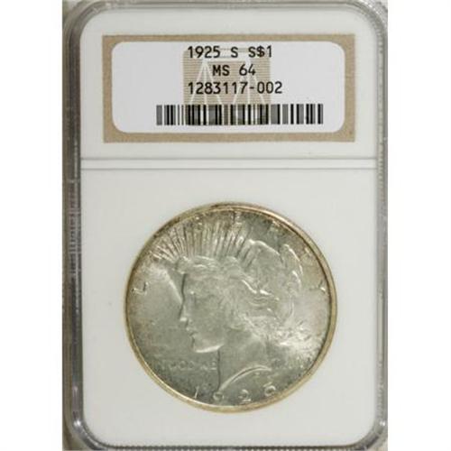 <B>1925-S $1 MS64 NGC.</B></I> Freckles of olive-green travel over lustrous surfaces that are reasonably struck. A scattering of light ticks limits the grade.<BR><BR><B>Coin Engraver:</B> Anthony de Francisci<BR><BR><b>Shipping:</b> Coins & Currency (<a target="_blank" href="http://www.heritageauctions.com/common/shipping.php">view shipping information</a>)