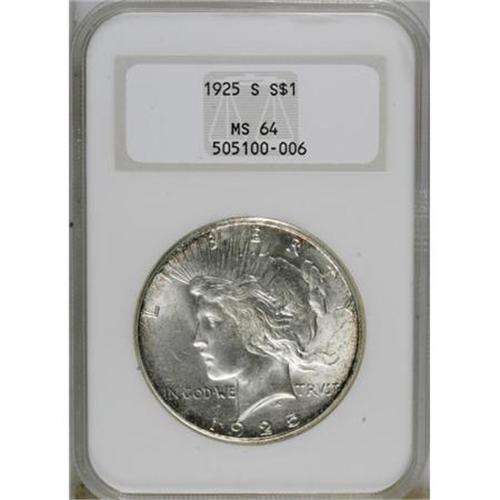 <B>1925-S $1 MS64 NGC.</B></I> VAM-6. The reverse is die doubled, similar to the VAM-3 Top 50 variety. This lustrous and nicely struck near-Gem has moderate sun-gold and sea-green peripheral toning. In a prior generation holder.<BR><BR><B>Coin Engraver:</B> Anthony de Francisci<BR><BR><b>Shipping:</b> Coins & Currency (<a target="_blank" href="http://www.heritageauctions.com/common/shipping.php">view shipping information</a>)