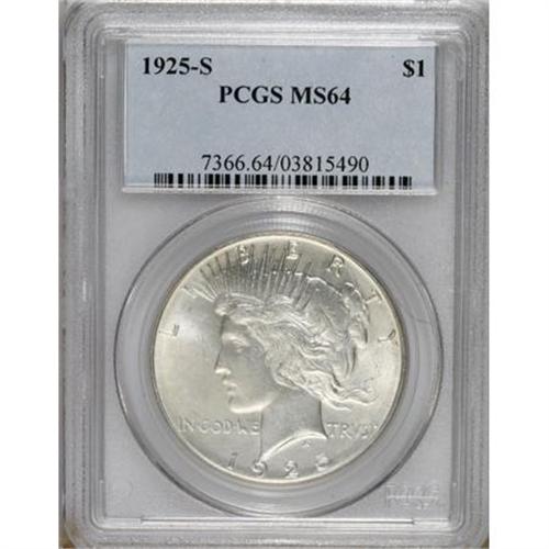 <B>1925-S $1 MS64 PCGS.</B></I> Well struck with unusually crisp detailing over the central devices. This is a lustrous and attractive silvery-gray example that displays die polish lines in the fields, and only faint cloudiness on either side. A few minor coin-to-coin marks limit the grade.<BR><BR><b>Shipping:</b> Coins & Currency (<a target="_blank" href="http://www.heritageauctions.com/common/shipping.php">view shipping information</a>)