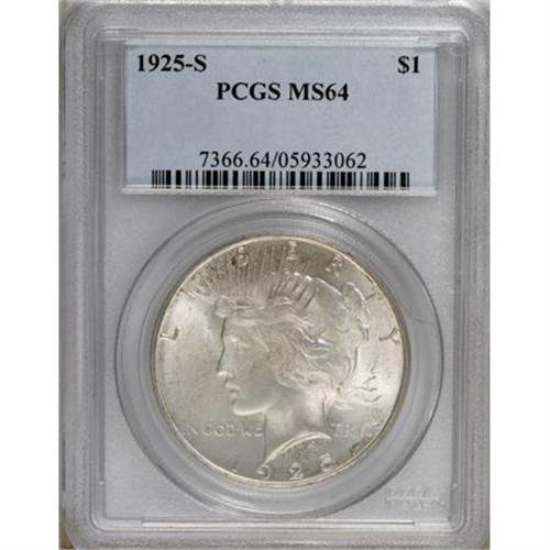 <B>1925-S $1 MS64 PCGS.</B></I> This cream-gray and olive-gold near-Gem has unencumbered luster and a hint of striking softness in the centers. The occasional faint grazes are customary for the grade.<BR><BR><b>Shipping:</b> Coins & Currency (<a target="_blank" href="http://www.heritageauctions.com/common/shipping.php">view shipping information</a>)