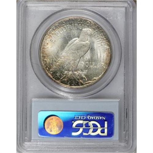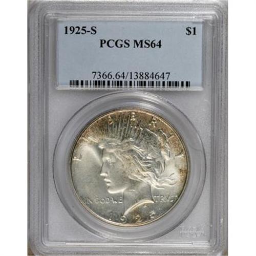 <B>1925-S $1 MS64 PCGS.</B></I> Bright and semi-prooflike, with speckled red-brown and forest-green peripheral patina and silver-gray centers. Clean for the MS64 grade level, and surprisingly rare any finer. <BR><BR><b>Shipping:</b> Coins & Currency (<a target="_blank" href="http://www.heritageauctions.com/common/shipping.php">view shipping information</a>)