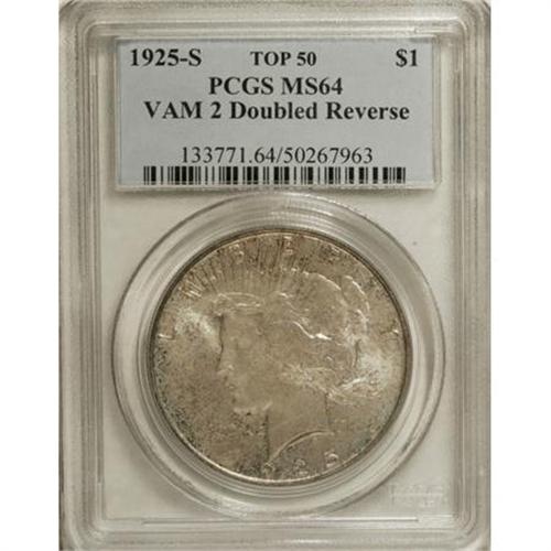 <B>1925-S $1 MS64 PCGS.</B></I> VAM-2. A Top 50 Variety. This "Doubled Reverse" variety has prominent doubling on most of the central design elements. Well struck with subtle luster that peeks out from beneath rich, dappled plum and champagne patina. Population: 5 in 64, 0 finer (4/07).<BR><BR><b>Shipping:</b> Coins & Currency (<a target="_blank" href="http://www.heritageauctions.com/common/shipping.php">view shipping information</a>)