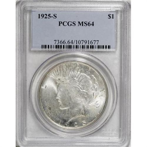 <B>1925-S $1 MS64 PCGS.</B></I> Lustrous surfaces reveal splotches of russet and olive-green, and display typically struck design elements. A couple of light marks on each side define the grade.<BR><BR><B>Coin Engraver:</B> Anthony de Francisci<BR><BR><b>Shipping:</b> Coins & Currency (<a target="_blank" href="http://www.heritageauctions.com/common/shipping.php">view shipping information</a>\)