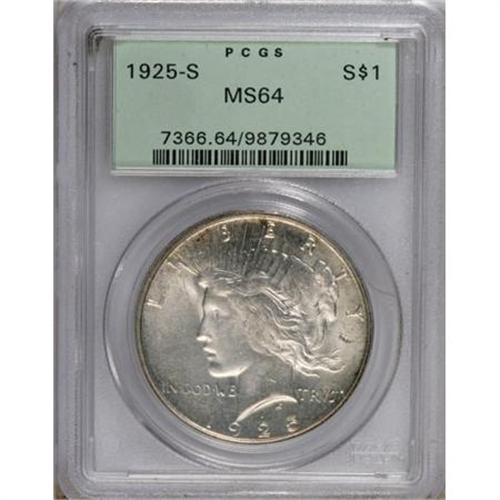<B>1925-S $1 MS64 PCGS.</B></I> A well struck near-Gem that displays pleasing luster and a delicate veil of cloud-gray patina over each side. Small dots of gold and reddish-bronze patina appear near the margins of this lower-mintage S-mint piece.<BR><BR><B>Coin Engraver:</B> Anthony de Francisci<BR><BR><b>Shipping:</b> Coins & Currency (<a target="_blank" href="http://www.heritageauctions.com/common/shipping.php">view shipping information</a>)