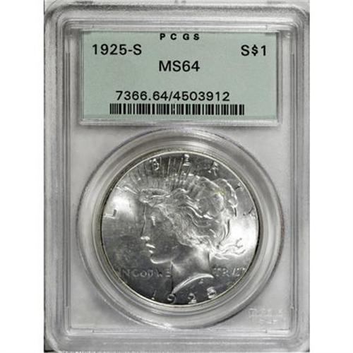 <B>1925-S $1 MS64 PCGS.</B></I> Intense mint frost shimmers over each side of this brilliant, snow-white example. The design elements are boldly rendered, as scattered small abrasions limit the grade. In a green label holder.<BR><BR><B>Coin Engraver:</B> Anthony de Francisci<BR><BR><b>Shipping:</b> Coins & Currency (<a target="_blank" href="http://www.heritageauctions.com/common/shipping.php">view shipping information</a>)