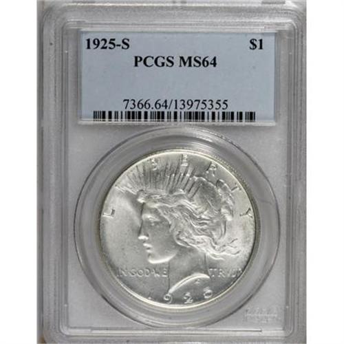 <B>1925-S $1 MS64 PCGS.</B></I> A brilliant and beautiful Choice scarcer date Peace dollar. Well struck aside from the base of the Y in LIBERTY, and even thorough study fails to locate more than negligible contact.<BR><BR><B>Coin Engraver:</B> Anthony de Francisci<BR><BR><b>Shipping:</b> Coins & Currency (<a target="_blank" href="http://www.heritageauctions.com/common/shipping.php">view shipping information</a>)