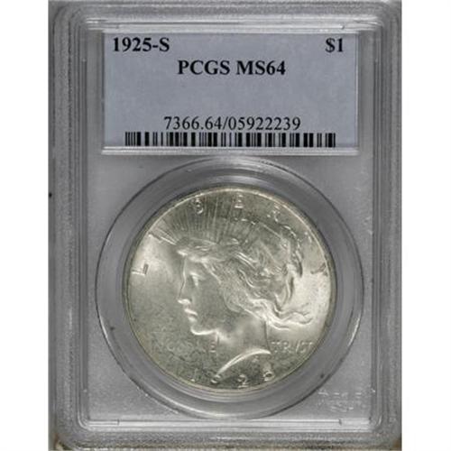 <B>1925-S $1 MS64 PCGS.</B></I> PCGS Population (1476/36). NGC Census: (1416/53). Mintage: 1,610,000. Numismedia Wsl. Price for NGC/PCGS coin in MS64: $815. (#7366)<BR><BR><B>Coin Engraver:</B> Anthony de Francisci<BR><BR><b>Shipping:</b> Coins & Currency (<a target="_blank" href="http://www.heritageauctions.com/common/shipping.php">view shipping information</a>)