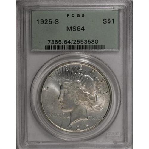 <B>1925-S $1 MS64 PCGS.</B></I> VAM-3. A Top 50 Variety. The "Doubled Wing" VAM, although undesignated as such within its green label holder. Both sides of this highly lustrous near-Gem have speckled gold toning over brilliant silver surfaces. Crisply struck aside from the G in GOD.<BR><BR><B>Coin Engraver:</B> Anthony de Francisci<BR><BR><b>Shipping:</b> Coins & Currency (<a target="_blank" href="http://www.heritageauctions.com/common/shipping.php">view shipping information</a>)
