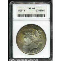 <B>1925<S$1> MS66 ANACS.</B></I> The gorgeous lemon and peach colors are particularly vivid across the upper obverse of this exquisitely struck and lustrous premium Gem. The cheek is virtually devoid of contact. A lovely type coin for the demanding collector with a preference for rich original patina. <BR><BR><B>Important notice:</B> Heritage usually auctions material at the rate of 200-250 lots per hour. On some occasions eBay Live bid software or the Internet may not be able to keep up with the pace of the auction. We recommend placing a realistic absentee bid now as insurance to avoid disappointment. Occasionally the auctioneer may eliminate or reject an eBay Live bid, and the auctioneer may also reopen a lot after the close of the eBay live bidding (usually because we missed an audience bid), and may reject your bid even if it shows you as the winning bidder. By bidding via eBay Live, you agree that Heritage may award the lot to another bidder at its sole discretion under the circumstances described above or any other reasonable circumstances. Since eBay bids are not shown to us until we open the lot on the floor, we treat those bids just like floor bids. In most cases the floor responds before the eBay bid is presented to us, due to Internet lag time, so for consistency we have made it a policy that floor bids are always considered first over tie eBay live bids. Also please note that all Heritage lots purchased through eBay Live carry a 20% Buyer's Premium. Please make sure you read the Terms and Conditions before you bid. </span></font></tr></table></td></tr></table>