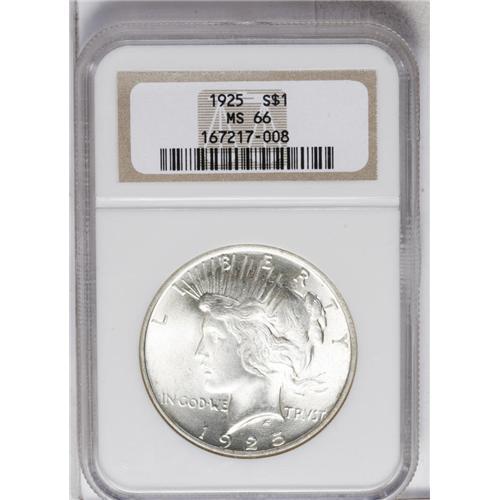<B>1925<img border='0' src='http://www.heritagecoins.com/images/star.gif' width=10 height=10>$1> MS66 NGC.</B></I> This sharply struck and unblemished Premium Gem possesses vibrant luster, and provides impressive eye appeal. The obverse has a moderate orange peel texture, as made from a long in use die.