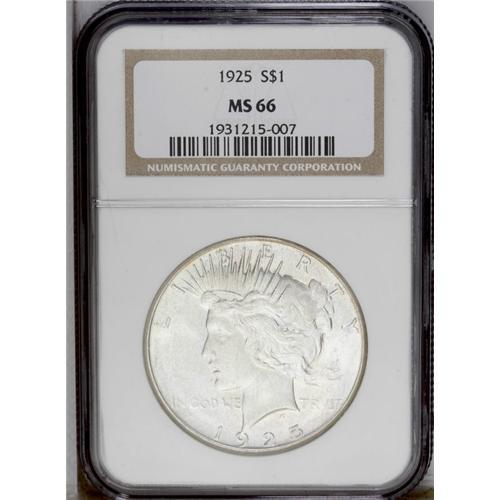 <B>1925<img border='0' src='http://www.heritagecoins.com/images/star.gif' width=10 height=10>$1> MS66 NGC.</B></I> Toned in unusual pastel rose, lime, and gold hues. This nicely struck and fully lustrous Premium Gem has clean surfaces. A worthy addition to a silver type set.