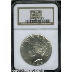 <B>1925<S$1> MS66 NGC.</B></I> Frosty with pleasing cartwheel luster atop the brilliant, mark-free surfaces. A great value coin for the budget minded collector. <BR><BR><B>Important notice:</B> Heritage usually auctions material at the rate of 200-250 lots per hour. On some occasions eBay Live bid software or the Internet may not be able to keep up with the pace of the auction. We recommend placing a realistic absentee bid now as insurance to avoid disappointment. Occasionally the auctioneer may eliminate or reject an eBay Live bid, and the auctioneer may also reopen a lot after the close of the eBay live bidding (usually because we missed an audience bid), and may reject your bid even if it shows you as the winning bidder. By bidding via eBay Live, you agree that Heritage may award the lot to another bidder at its sole discretion under the circumstances described above or any other reasonable circumstances. Since eBay bids are not shown to us until we open the lot on the floor, we treat those bids just like floor bids. In most cases the floor responds before the eBay bid is presented to us, due to Internet lag time, so for consistency we have made it a policy that floor bids are always considered first over tie eBay live bids. Also please note that all Heritage lots purchased through eBay Live carry a 20% Buyer's Premium. Please make sure you read the Terms and Conditions before you bid. </span></font></tr></table></td></tr></table>
