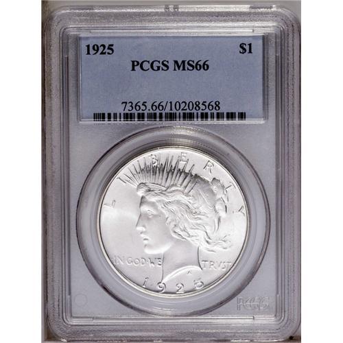 <B>1925<img border='0' src='http://www.heritagecoins.com/images/star.gif' width=10 height=10>$1> MS66 PCGS.</B></I> Essentially untoned surfaces exude sparkling luster, and reveal sharply struck motifs. Just a few minor marks are scattered about. PCGS has seen 65 pieces finer (3/06). <BR><BR><B>Important notice:</B> Heritage usually auctions material at the rate of 200-250 lots per hour. On some occasions eBay Live bid software or the Internet may not be able to keep up with the pace of the auction. We recommend placing a realistic absentee bid now as insurance to avoid disappointment. Occasionally the auctioneer may eliminate or reject an eBay Live bid, and the auctioneer may also reopen a lot after the close of the eBay live bidding (usually because we missed an audience bid), and may reject your bid even if it shows you as the winning bidder. By bidding via eBay Live, you agree that Heritage may award the lot to another bidder at its sole discretion under the circumstances described above or any other reasonable circumstances. Since eBay bids are not shown to us until we open the lot on the floor, we treat those bids just like floor bids. In most cases the floor responds before the eBay bid is presented to us, due to Internet lag time, so for consistency we have made it a policy that floor bids are always considered first over tie eBay live bids. Also please note that all Heritage lots purchased through eBay Live carry a 20% Buyer's Premium. Please make sure you read the Terms and Conditions before you bid. This lot is being auctioned in conjunction with a live floor auction by Heritage Galleries & Auctioneers. All final auction and invoice information will be supplied by Heritage Galleries & Auctioneers, and all other information should be considered preliminary. Lot:3841 <BR><BR><B>Winning Notification and Billing:</B> After the FINAL session in this auction is complete, Heritage will send e-mail and snail mail invoices. This process normally takes several days. All final auction and invoice information will be supplied by Heritage Galleries & Auctioneers, and all other information should be considered preliminary. <BR><BR>This auction will be conducted on a live auction floor and over the Internet through eBay Live. If you choose to place an absentee bid, please take a moment to <font color='#0000ff'><u><a href='http://pages.ebay.com/liveauctions/help/before/laabsentee.html'>learn how eBay Live absentee bidding works</a></u></font><font color='#000000'>