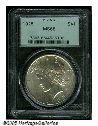 <B>1925<S$1> MS66 PCGS.</B></I> Medium gold color graces this lustrous and boldly struck premium Gem. The obverse is gorgeously preserved, as is the reverse save for a nick on the rim at 8 o'clock. Certified in an old green label holder.