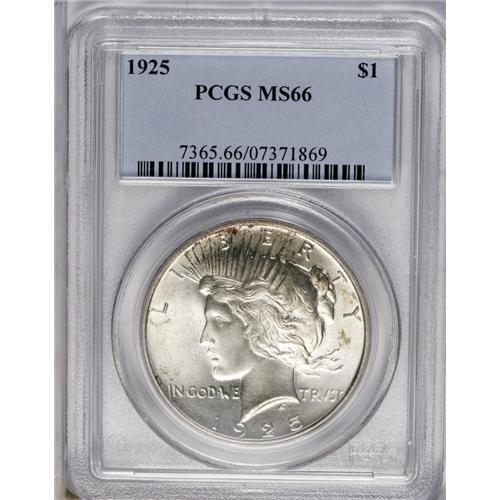 <B>1925<img border='0' src='http://www.heritagecoins.com/images/star.gif' width=10 height=10>$1> MS66 PCGS.</B></I> Nicely struck for this issue with shimmering luster and spots of reddish-brown toning. A few tiny marks are scattered in the fields, away from the prime focal areas.