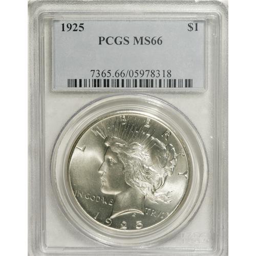 <B>1925 S$1 MS66 PCGS.</B></I> This high grade Peace dollar has booming luster and unmarked surfaces. Only a trace of tan denies full brilliance. A good strike, with only slight incompleteness near the centers.<BR><BR><b>Shipping:</b> Coins & Currency (<a target="_blank" href="http://www.heritageauctions.com/common/shipping.php">view shipping information</a>)
