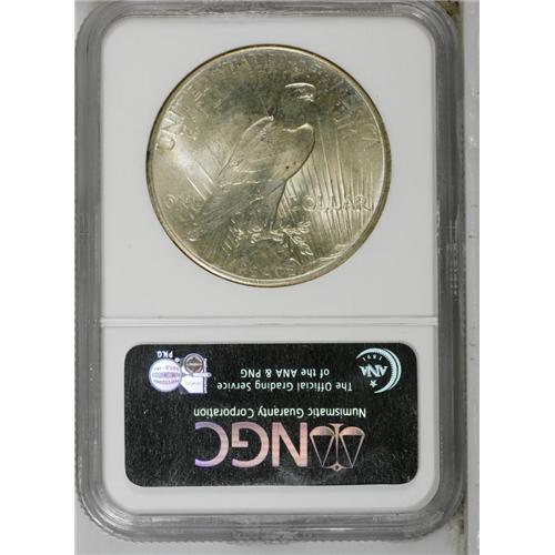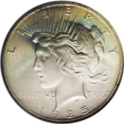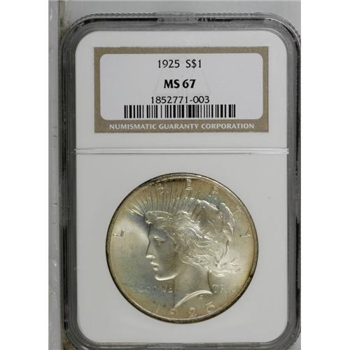 <B>1925 S$1 MS67 NGC.</B></I> The 1925 Peace dollar is common in Uncirculated grades through MS66. The population numbers drop off significantly above the latter grade level; indeed, fewer than 100 specimens have been designated Superb Gem (MS67) by NGC and PCGS combined, and a mere two pieces have been certified finer. The present MS67 coin shows intense luster with delicate hues of rainbow-like color. The strike on the design features is well brought up, and a few tiny marks at the base of Liberty's neck and on the eagle do not in the least betray the grade designation.<BR><BR><b>Shipping:</b> Coin/Currency (<a target="_blank" href="http://www.heritageauctions.com/common/shipping.php">view shipping information</a>)