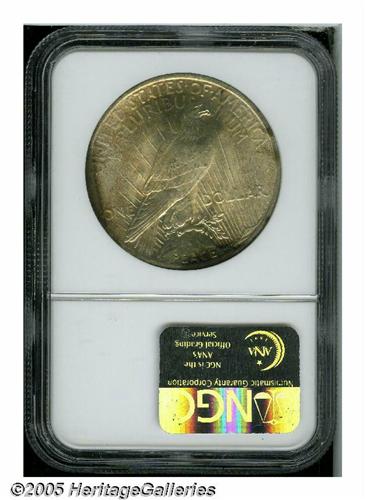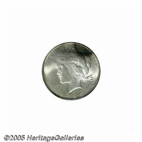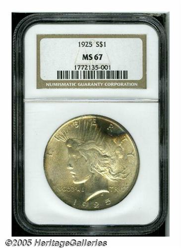 <B>1925<S$1> MS67 NGC.</B></I> This example is from one of the finest Peace Dollar Sets to appear on the NGC Registry, well within the top 10 sets. The surfaces have splendid champagne toning with splashes of iridescence. Both obverse and reverse have intense underlying mint frost. This is one of just 19 examples of the issue to be similarly graded by NGC, with only one finer coin.